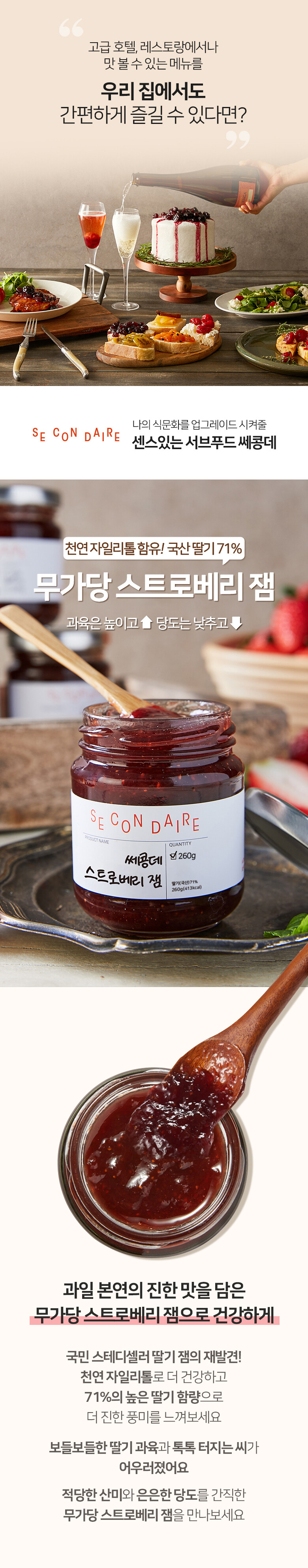 어릴 적부터 처음 접하게 되는 잼이 딸기잼 일 거예요. 그만큼 익숙한 잼이지만 국산 딸기 함량이 71%인 잼은 그 어디에서도 찾아보기 힘들죠. 높은 과일 함량으로 딸기 풍미 가득한 쎄콩데의 스테디셀러 스트로베리 잼입니다.
