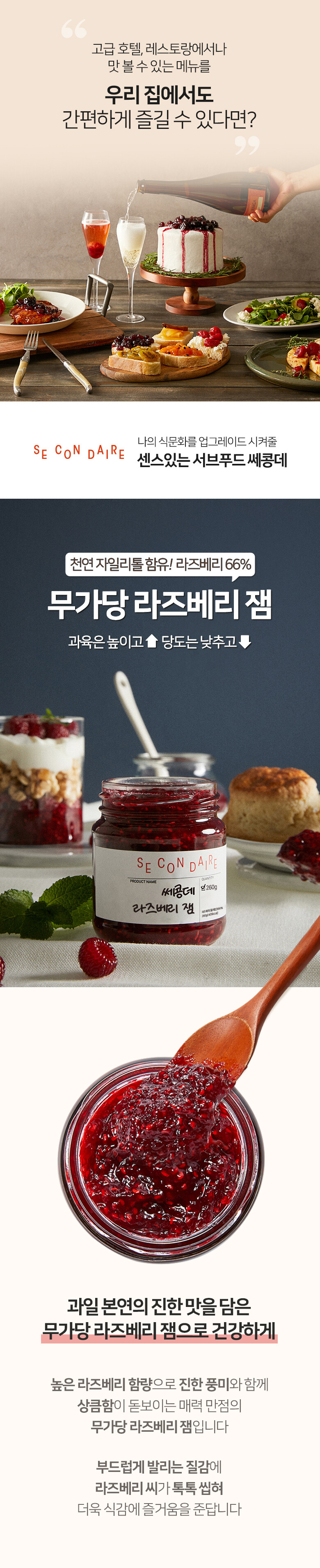 높은 라즈베리 함량으로 진한 풍미와 함께 상큼함이 돋보이는 매력 만점의 라즈베리잼 입니다.
